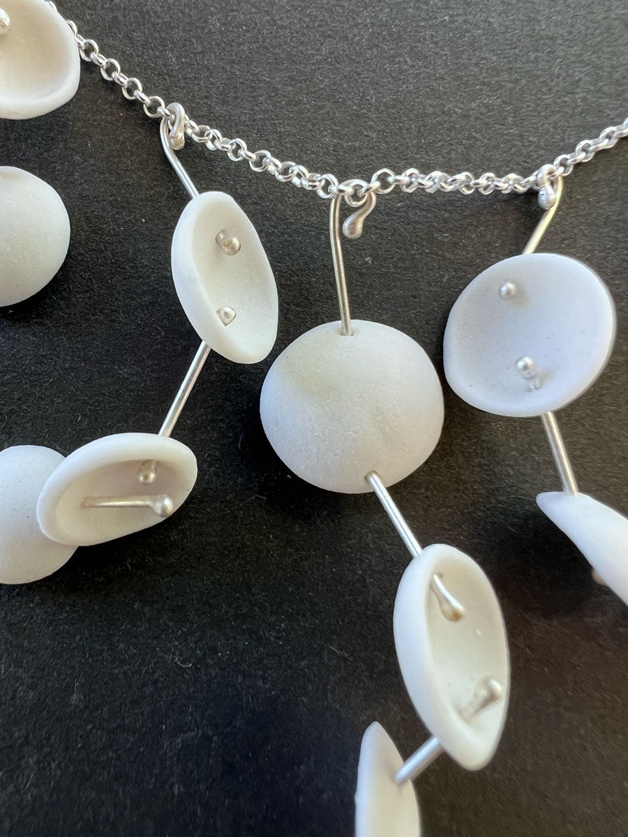 I strive to interact with the wearer in both a tactile and visual way. The cool surface of the porcelain and the unexpected layering of curves and cylinders, allow tactile exploration by the wearer.
